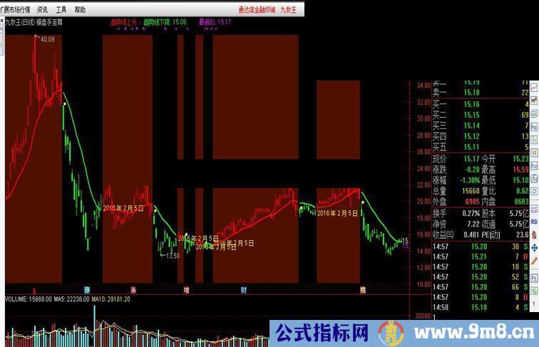 买入:=FILTER(MR,10);DRAWTEXT(减仓,HIGH*1.01,51),COLORCYAN; DRAWTEXT(买入 AND SJTJ,LOW*0.99,52),COLORYELLOW; DRAWTEXT(清仓 AND SJTJ ,HIGH*1.02,53),COLORGREEN; DRAWTEXT(强势狙击 AND SJTJ,LOW*0.98,54),COLORYELLOW; VAR21:=MAX(ABS(HIGH-AMOUNT/VOL/100),ABS(AMOUNT/VOL/100-LOW)); VAR3:=ABS((OPEN+CLOSE)/2-AMOUNT/VOL/100);MV:=(VAR21+VAR3)/AMOUNT*VOL*100*50; Z:=REF(CLOSE,4); Q:=REF(CLOSE,10); XX1:=MIN(Z,Q); DD1:=MAX(Z,Q); XX2:=(LLV(LOW,5)+XX1)/2; DD2:=(HHV(HIGH,5)+DD1)/2; XXX:=MIN(XX1,XX2); DDD:=MAX(DD1,DD2); KK8:=BARSLAST(CROSS(XXX,CLOSE)); KD8:=BARSLAST(CROSS(CLOSE,DDD)); DK11:=KK8>KD8; KK11:=KD8>KK8; MAH:=(H*18+REF(H,1)*17+REF(H,2)*16+REF(H,3)*15+REF(H,4)*14+REF(H,5)*13+REF(H,6)*12+REF(H,7)*11+REF(H,8)*10+REF(H,9)*9+REF(H,10)*8+REF(H,11)*7+REF(H,12)*6+REF(H,13)*5+REF(H,14)*4+REF(H,15)*3+REF(H,16)*2+REF(H,17)*1)/171; MAL:=(L*18+REF(L,1)*17+REF(L,2)*16+REF(L,3)*15+REF(L,4)*14+REF(L,5)*13+REF(L,6)*12+REF(L,7)*11+REF(L,8)*10+REF(L,9)*9+REF(L,10)*8+REF(L,11)*7+REF(L,12)*6+REF(L,13)*5+REF(L,14)*4+REF(L,15)*3+REF(L,16)*2+REF(L,17)*1)/171; DK12:= CLOSE>=MAH ;KK12:= MAL>CLOSE; DK:= SJTJ&&((DK11 AND C<=12000) ||(DK12 AND C>12000)); KK:= SJTJ&&((KK11 AND C<=12000) ||(KK12 AND C>12000)); DK1:=BARSLAST(DK); KK1:=BARSLAST(KK); DK2:=BARSLAST(CROSS(KK1,DK1)); KK2:=BARSLAST(CROSS(DK1,KK1)); HS:=DK2 LS:=KK2 W2:=OPEN-CLOSE; HT:=IF(OPEN>CLOSE,OPEN,CLOSE); LT:=IF(OPEN STICKLINE(HS,REFDATE(HHV(H,0),DATE),REFDATE(LLV(L,0),DATE),6,0),COLOR001050; STICKLINE(LS,REFDATE(HHV(H,0),DATE),REFDATE(LLV(L,0),DATE),6,0),COLORBLACK; STICKLINE(W2>0 AND HS,OPEN,CLOSE,2,0),COLORRED; STICKLINE(W2>0 AND HS,OPEN,H,0.0,0),COLORRED; STICKLINE(W2>0 AND HS,C,L,0.0,0),COLORRED; STICKLINE(W2<=0 AND HS,OPEN,CLOSE,2,1),COLORRED; STICKLINE(W2<=0 AND HS,O,L,0.0,0),COLORRED; STICKLINE(W2<=0 AND HS,C,H,0.0,0),COLORRED; STICKLINE(W2>0 AND LS,OPEN,CLOSE,2,0),COLORGREEN; STICKLINE(W2>0 AND LS,OPEN,H,0.0,0),COLORGREEN; STICKLINE(W2>0 AND LS,C,L,0.0,0),COLORGREEN; STICKLINE(W2<=0 AND LS,OPEN,CLOSE,2,1),COLORGREEN; STICKLINE(W2<=0 AND LS,C,H,0.0,0),COLORGREEN; STICKLINE(W2<=0 AND LS,O,L,0.0,0),COLORGREEN; DRAWTEXT(HS=1 AND REF(LS,1),LOW*0.995,20),COLORYELLOW; DRAWTEXT(LS=1 AND REF(HS,1),H*1.005,21),COLORYELLOW; 趋势线:=(MAH+MAL)/2 COLORGREEN,,LINETHICK2; 趋势线上升:IF(HS,趋势线,DRAWNULL),LINETHICK2,COLORRED; 趋势线下降:IF(LS,趋势线,DRAWNULL),LINETHICK2,COLORGREEN; DRAWNUMBER(ISLASTBAR AND LS AND C>12000,MAH,MAH),COLORYELLOW; DRAWNUMBER(ISLASTBAR AND HS AND C>12000,MAL,MAL),COLORYELLOW; DRAWNUMBER(ISLASTBAR AND LS AND C<=12000,DDD,DDD),COLORYELLOW; DRAWNUMBER(ISLASTBAR AND HS AND C<=12000,XXX,XXX),COLORYELLOW; DRAWNUMBER(ISLASTBAR ,C,C),COLORMAGENTA; 最新价:IF(SJTJ, C,DRAWNULL),LINETHICK0,COLORYELLOW;