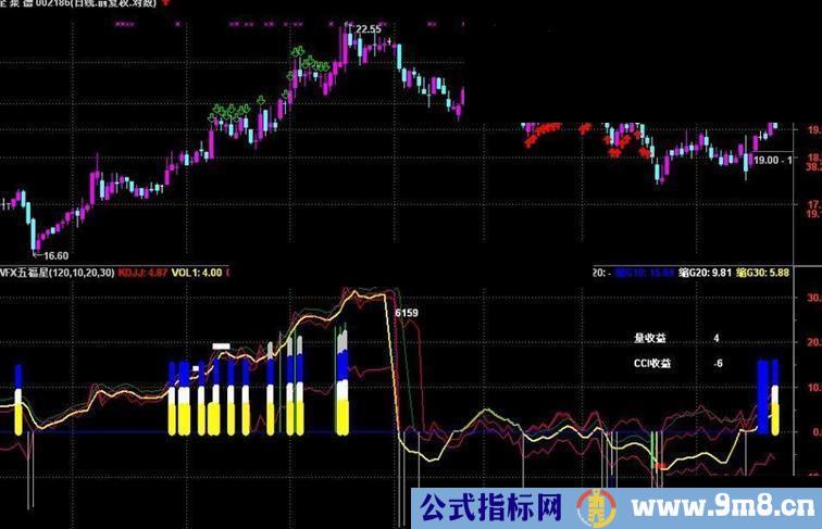 抄底:IF((JD+VD+CD+MD+BD)>=6 AND VARC<10,-9,DRAWNULL)STICK COLORYELLOW LINETHICK2;