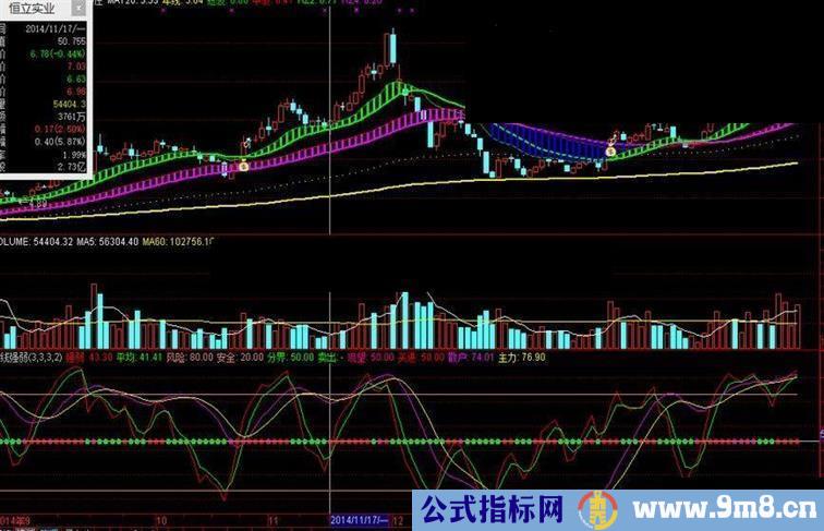 观望:IF((强弱>=平均 AND D>=REF(D,1) AND MA(C,3)>=REF(MA(C,3),1)) OR (D>=REF(D,1) AND 资金流>0 AND MA(C,3)>=REF(MA(C,3),1)) OR(强弱>=平均 AND 资金流>0 AND MA(C,3)>=REF(MA(C,3),1)) OR (强弱>=平均 AND 资金流>0 AND D>=REF(D,1)),50,DRAWNULL),CIRCLEDOT,LINETHICK2,COLORLIMAGENTA;
