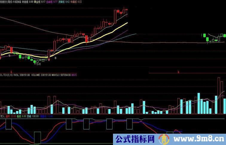 VAR1:=(EMA(C,12)-EMA(C,26))*100+50; VAR2:=EMA(VAR1,9); VAR3:=((HHV(H,21)-C)/(HHV(H,21)-LLV(L,21)))*100-10; VAR4:=((C-LLV(L,21))/(HHV(H,21)-LLV(L,21)))*100; VAR5:=SMA(VAR4,13,8); VAR6:=SMA(VAR3,21,8); VAR7:=MA(C,80)-MA(C,10)/7; VAR8:=EMA(C,5); VAR9:=MA((LLV(C,9))*1.1,14); VAR10:=2*VAR9-VAR8-C*0.1; VAR11:=IF(((VAR8-VAR10)*5>0),(POW((VAR8-VAR10)*5,2))/10,(-1*(POW((VAR8-VAR10)*(5),2)))/(10)); VAR12:=IF((VAR11>0),VAR11-0,12); VAR13:=SMA(MAX(C-REF(C,2),0),7,1)/SMA(ABS(C-REF(C,2)),7,1)*100; 趋势:CEILING(SMA(VAR5,13,8)),LINETHICK2,COLOR0000FF; 看底:IF((趋势-VAR6<(-65)),1,6),COLOR00FF00; 顶峰:IF((趋势-VAR6>85),95,100),COLORF0F000; 黄金区:DRAWICON(IF(VAR13<15,15,0),13,1),COLORYELLOW; 操盘线: MA(3*SMA((C-LLV(L,27))/(HHV(H,27)-LLV(L,27))*100,5,1)-2*SMA(SMA((C-LLV(L,27))/(HHV(H,27)-LLV(L,27))*100,5,1),3,1),5),LINETHICK2,COLORBLUE; STICKLINE(FILTER(趋势75 OR CROSS(趋势,操盘线)AND 趋势60,5),100,60,8,1),COLORFFFF00; STICKLINE(FILTER(CROSS(趋势,VAR12)AND 趋势REF(C,1) OR 趋势>REF(趋势,1)AND 趋势<35 AND C>REF(C,1),5),5,50,9,2),COLOR00FF00;