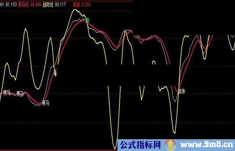 DRAWTEXT(CROSS(黑马线,A5)AND 趋势线<80,黑马线,'追涨');