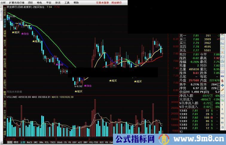 DRAWTEXT(CROSS(MA(C,3),MA(C,9)) AND C>=REF(C,1) AND C>O,L*0.98,'★加仓'),COLORMAGENTA;