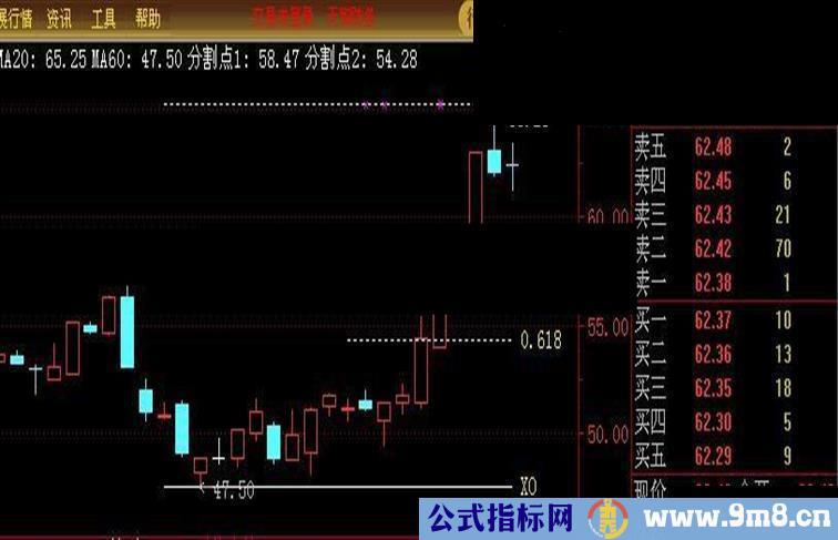 分割点1:IF(CURRBARSCOUNT<=10,高J-(高J-低J)*0.382,DRAWNULL),COLORWHITE,DOTLINE;