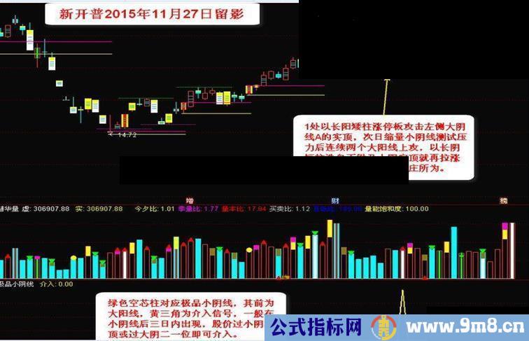 下面介绍一种极品小阴线(副图上用空心阴柱标志)战法,它类似于王子老师发明的“悬阴三一”战法。
