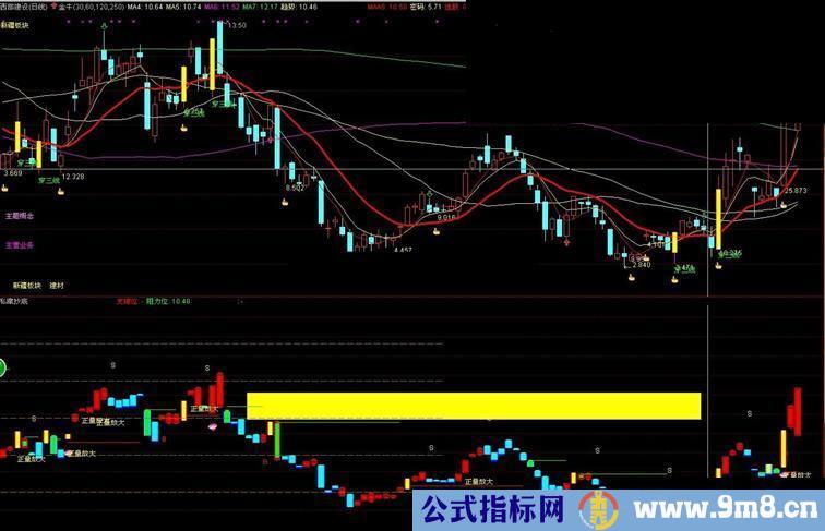 DRAWTEXT(C>REF(C,1)*1.02 AND V/REF(MA(V,5),1)>2,L*0.98,'正量放大'),COLORYELLOW;