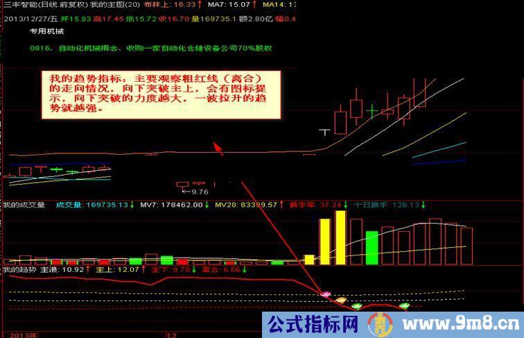 我的趋势指标:主要观察粗红线(离合)的走向情况,向下突破主上,会有图标提示,向下突破的力度越大,一波拉升的趋势就越强