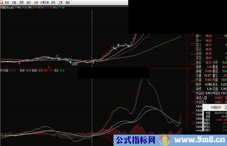 用法是:红线从绿上上出来,赚大钱的机会来了,简单说变双线买入赚线,变单绿线无条件走人,大家可以看到,没有未来,极为准确,是极品中的极品,按这个副图操作,能不赚钱真的很难
