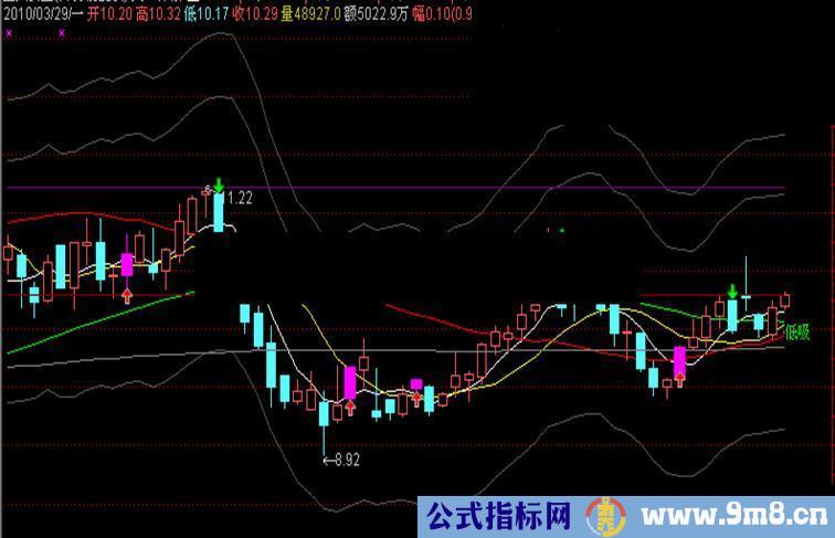 IF(五V<=REF(五V,1) ,离D,DRAWNULL),COLOR00FF00,LINETHICK1;}