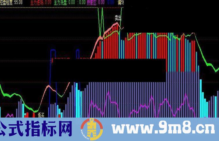 用法:灰色柱开始出现---表现为主力开始控盘,红色柱50以上--表现为主力高度控盘,兰柱青色芯---主力开始减仓即派发,这时不要贪,与主力采取同步操作获利了结。青色柱阶段--持币休息。特别是图中下方出现青色小方格时,更要耐心持币等待进场机会的到来!优化后的“主力控盘”指标,增加了--主力进场--主力洗盘--持股区--超买--超卖--低买--卖出等参考判断!请与MACD--VOL--DMI配合使用,效果更佳
