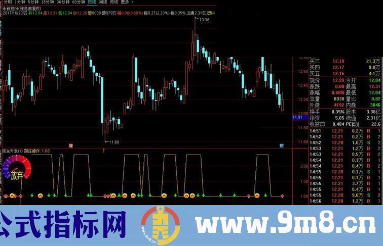 VARE:=REF(VARD,1) AND CLOSE>=REF(CLOSE,1) AND CLOSE<=REF(CLOSE,2); VARF:=REF(VARE,1) AND CLOSE<=REF(CLOSE,1) AND CLOSE>=REF(CLOSE,2); VAR10:=REF(VARF,1) AND CLOSE>=REF(CLOSE,1) AND CLOSE<=REF(CLOSE,2); VAR11:=REF(VAR10,1) AND CLOSE<=REF(CLOSE,1) AND CLOSE>=REF(CLOSE,2); VAR12:=REF(VAR11,1) AND CLOSE>=REF(CLOSE,1) AND CLOSE<=REF(CLOSE,2); VAR13:=REF(VAR12,1) AND CLOSE<=REF(CLOSE,1) AND CLOSE>=REF(CLOSE,2); VAR14:=REF(VAR13,1) AND CLOSE>=REF(CLOSE,1) AND CLOSE<=REF(CLOSE,2); VAR15:=REF(VAR14,1) AND CLOSE<=REF(CLOSE,1) AND CLOSE>=REF(CLOSE,2); VAR16:=REF(VAR15,1) AND CLOSE>=REF(CLOSE,1) AND CLOSE<=REF(CLOSE,2); VAR17:=REF(VAR16,1) AND CLOSE<=REF(CLOSE,1) AND CLOSE>=REF(CLOSE,2); VAR18:=REF(VAR17,1) AND CLOSE>=REF(CLOSE,1) AND CLOSE<=REF(CLOSE,2); 减:REF(VAR1 OR VAR2 OR VAR3 OR VAR4 OR VAR5 OR VAR6 OR VAR7 OR VAR8 OR VAR9 OR VARA OR VARB OR VARC,1) AND VARD,STICK,COLOR000000; DRAWICON(减>0,减,2); AC:=AMOUNT/(VOL); YY:=MA(AC,13); LLL:=(C-YY)/YY*100; MIDC := MA(CLOSE,22); UPPERC:= MIDC + 2*STD(C,22); LOWERC:= MIDC - 2*STD(C,22); BBA:=(C-LOWERC)/(UPPERC-LOWERC); 进点:(REF(LLL,1)<-15 AND REF(BBA,1)<0 AND LLL>REF(LLL,1)),STICK,COLOR000000; DRAWTEXT(进点,0.4,'B'),COLOR0000FF; DRAWICON(进点>0,进点,1); M2:=EMA(C,2); M18:=EMA(C,18); 买点:=IF(CROSS(M18,M2),5,0* 10000); RSVV:=(CLOSE-LLV(LOW,10))/(HHV(HIGH,10)-LLV(LOW,10))*100; VARB2:=(RSVV/2+22)*1; Q:=EMA(VOL,13); Y:=EMA(AMOUNT,13); S:=((Y /Q) / 100); X:=(((CLOSE -S) / S) * 100); F:=((X < (0)) AND ZXNH); XQ:=F AND RSVV 突击:买点 AND XQ ,STICK,COLOR000000; DRAWTEXT(突击,0.5,'调'),COLORFFFFFF; DRAWTEXT(突击,0.1,'买'),COLORFFFFFF; DRAWICON(突击>0,突击,23); AX:=(ATAN((MA(C,5)/REF(MA(C,5),1)-1)*100)*180/3.14115926); AXMA:=MA(AX,5); ANA:=PLOYLINE(CROSS(AX,AXMA),AXMA); ANB:=PLOYLINE(CROSS(AXMA,AX),AXMA); MD:=CROSS(AX,AXMA) AND ((ANB>REF(ANB,1) AND ANB>ANA AND AXMA<=0) OR ((AXMA<=-45 OR CROSS(AXMA,-45)) AND (ANB<-60 OR LLV("KDJ.J",3)<=-49) AND ANB>0)); AQZ:=COUNT(CROSS(AX,AXMA),ANAREF(ANB,5)); 阴买:MD AND AQZ AND C DRAWTEXT(阴买,0.5,'阴'),COLORFFFFFF; DRAWTEXT(阴买,0.1,'买'),COLORFFFFFF; DRAWICON(阴买>0,阴买,34); LC:=REF(C,1); RSV34:=100*(C-LLV(L,34))/(HHV(H,34)-LLV(L,34)); K34:=SMA(RSV34,3,1); BIAS34:=((C-MA(C,34))/MA(C,34)*100+10)*5; KB34:=(K34+BIAS34)/4+10; BB1:=IF((K34<10 OR (K34<15 AND HHV(H,5)/LLV(C,5)>1.15)) AND KB34<=-0.5,1,0); 抢反弹:BB1=1 AND C=LLV(C,10) AND C DRAWTEXT(抢反弹,0.5,'抢'),COLORFFFFFF; DRAWTEXT(抢反弹,0.1,'反'),COLORFFFFFF; DRAWICON(抢反弹>0,抢反弹,11); 短期:=100*(C-LLV(L,5))/(HHV(C,5)-LLV(L,5)); 中期:=100*(C-LLV(L,10))/(HHV(C,10)-LLV(L,10)); 中长期:=100*(C-LLV(L,20))/(HHV(C,20)-LLV(L,20)); 长期:=100*(C-LLV(L,30))/(HHV(C,30)-LLV(L,30)); 四线归一:短期<6 AND 中期<6 AND 中长期<6 AND 长期<6,STICK,COLOR000000; DRAWTEXT(四线归一,0.5,'归'),COLORFFFFFF; DRAWTEXT(四线归一,0.1,'一'),COLORFFFFFF; DRAWICON(四线归一>0,四线归一,5); 短转点:(((SMA(C,2,1)-(SMA(L,21,2)*0.95))*10)<2 AND SMA(C,2,1)>REF(SMA(C,2,1),1) AND REF(SMA(C,2,1),2)>REF(SMA(C,2,1),1))=1,STICK,COLOR000000; DRAWTEXT(短转点,0.5,'短'),COLORFFFFFF; DRAWTEXT(短转点,0.1,'转'),COLORFFFFFF; DRAWICON(短转点>0,短转点,23); {======================================================} 范围高A:=REFDATE(HHV(H,120),DATE)*1.05; 范围低A:=REFDATE(LLV(L,120),DATE)*0.95; MA5:=MA(C,5),COLORCYAN,LINETHICK2; MA24:=MA(C,24),COLORGREEN,LINETHICK2; MA72:=MA(C,72),COLORRED,LINETHICK2; MA200:=IF((MA(C,200)<=范围高A AND MA(C,200)>=范围低A) OR C>=MA(C,200),MA(C,200),DRAWNULL),COLORBLUE,LINETHICK2; {=======================仪表盘=========================} 主升浪:=ISLASTBAR AND MA5>MA24 AND MA24>MA72 AND MA72>IF(MA200=DRAWNULL,0,MA200); 主浪回调:=ISLASTBAR AND MA24>MA5 AND MA5>MA72 AND MA72>IF(MA200=DRAWNULL,0,MA200); 主浪深调:=ISLASTBAR AND MA24>MA72 AND MA72>MA5 AND MA5>IF(MA200=DRAWNULL,0,MA200); 初升浪:=ISLASTBAR AND IF(MA200=DRAWNULL,300,MA200)>MAX(MA24,MA72) AND MA5>MA24 AND MA24>MA72; 底部反弹:=ISLASTBAR AND IF(MA200=DRAWNULL,300,MA200)>MA72 AND MA72>MA24 AND MA5>MA24; 探底阶段:=ISLASTBAR AND IF(MA200=DRAWNULL,300,MA200)>MA72 AND MA72>MA24 AND MA24>MA5; 观望:=ISLASTBAR AND IF(MA200=DRAWNULL,MA24>MA72 AND C 有牛:=ISLASTBAR AND IF(MA200=DRAWNULL,MA24 放弃:=ISLASTBAR AND IF(MA200=DRAWNULL,MA24 DRAWGBK(显示仪表盘1=1 AND 主升浪=0 AND 主浪回调=0 AND 主浪深调=0 AND 初升浪=0 AND 底部反弹=0 AND 探底阶段=0 AND 观望=0 AND 有牛=0 AND 放弃=0,0,0,0,'观望',0)COLOR00BF00; DRAWGBK(显示仪表盘1=1 AND 主升浪,0,0,0,'主升浪',0)COLORFF00FF; DRAWGBK(显示仪表盘1=1 AND 主浪回调,0,0,0,'主浪回调',0)COLORFF8080; DRAWGBK(显示仪表盘1=1 AND 主浪深调,0,0,0,'主浪深调',0)COLOR009500; DRAWGBK(显示仪表盘1=1 AND 初升浪,0,0,0,'初升浪',0)COLOR00FFFF; DRAWGBK(显示仪表盘1=1 AND 底部反弹,0,0,0,'底部反弹',0)COLORFFFF00; DRAWGBK(显示仪表盘1=1 AND 探底阶段,0,0,0,'探底阶段',0); DRAWGBK(显示仪表盘1=1 AND 观望,0,0,0,'观望',0)COLORFFFF00; DRAWGBK(显示仪表盘1=1 AND 有牛,0,0,0,'有牛',0)COLOR00FFFF; DRAWGBK(显示仪表盘1=1 AND 放弃,0,0,0,'放弃',0)COLOR00BF00; 步步高:=V/REF(V,1)>1.1 AND REF(V,1)/REF(V,2)>1.1; 挖坑:=V/REF(V,1)>1.20 AND REF(V,2)/REF(V,1)>1.07; 成量:=步步高 OR 挖坑; 潜伏:OO AND (H-MAX(C,O))/(H-L)>0.3 AND (H-MAX(C,O))/(H-L)>(MIN(O,C)-L)/(H-L) AND EMA(C,5)>REF(EMA(C,5),1) AND MA(C,3)>EMA(C,7) AND MA(C,5)>MA(C,10) AND C>MA(C,20) AND C>MA(C,60) AND (MIN(O,C)-L)/(H-L)>0.01 AND 成量 AND REF(C,1)/REF(C,2)<1.07 AND C/REF(C,1)<1.06,STICK,COLOR000000; DRAWTEXT(潜伏,0.5,'潜'),COLORFFFFFF; DRAWTEXT(潜伏,0.1,'伏'),COLORFFFFFF; DRAWICON(潜伏>0,潜伏,25); AA1:= AMOUNT/VOL; BB01:= LOW
