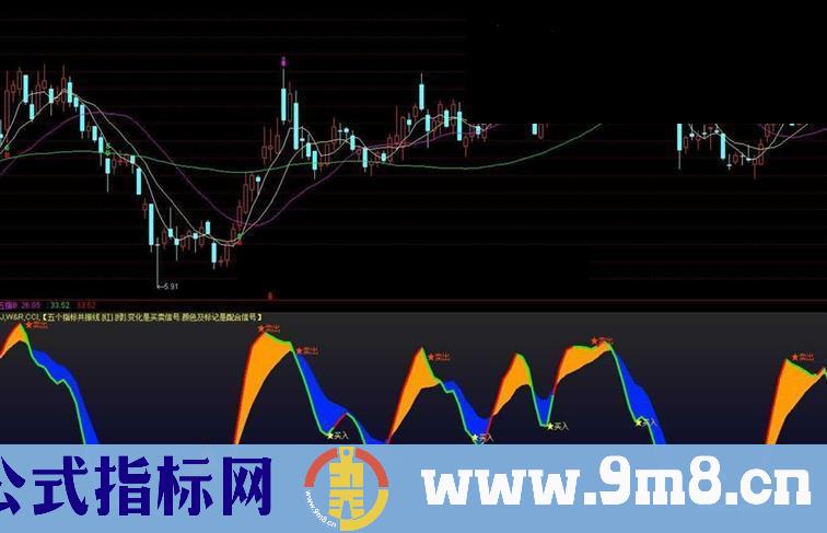 五个指标用一条线.用它们的共振显示买卖信号.别具一格(源码 副图)