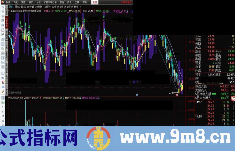 IF(DD5,MA5,DRAWNULL),COLOR00FF00; X0:=(3*C+L+O+H)/6; 多空线: (20*X0+19*REF(X0,1)+18*REF(X0,2)+17*REF(X0,3)+16*REF(X0,4)+15*REF(X0,5)+14*REF(X0,6) +13*REF(X0,7)+12*REF(X0,8)+11*REF(X0,9)+10*REF(X0,10)+9*REF(X0,11)+8*REF(X0,12) +7*REF(X0,13)+6*REF(X0,14)+5*REF(X0,15)+4*REF(X0,16)+3*REF(X0,17)+2*REF(X0,18)+ REF(X0,20))/210,COLORFF00FF,LINETHICK1; {用法:黄托底买进,绿压顶买出。}