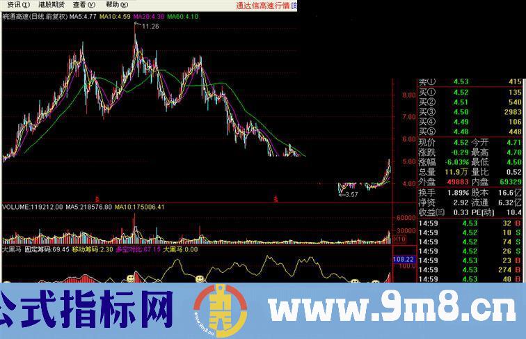 大黑马: IF(VAR13 AND VAR12>7 AND REF(VAR12,1)<0 AND VAR12-REF(VAR12,1)>9,1,0),LINETHICK3 ,