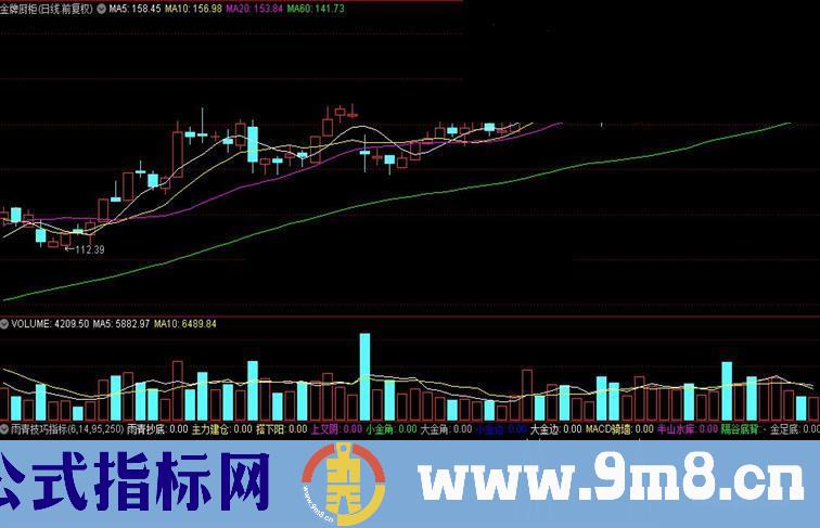 雨青抄底:M5>M4 AND SLOPE(M5,5)<0 AND SLOPE(M4,4)<0 AND SLOPE(MA3,3) AND REF(M4>MA3,1) AND CROSS(MA3,M4) AND VOL>VOL5;