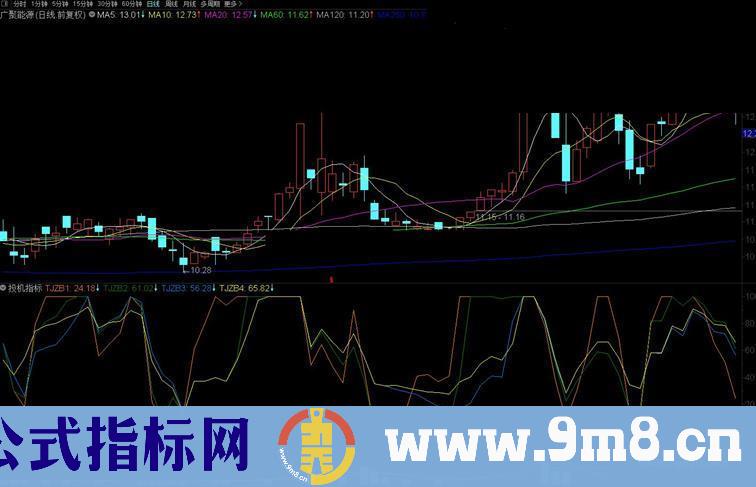 由于有上下边界的技术指标在接近边界(95以上,5以下)地方钝化,图形不直观,方向性不强。能否改善这个区间,让指标的方向性更强。笔者选用了WR和RSI指标配搭,以0-100为上下界,50为中轴,上强下弱。区间(5-95)用法同RSI。由于有上下界的局限,计算时将强弱势区间(95-100,0-5)的指标值取100或0。这样使单边趋势运行的股票在持续上涨时候指标在100走平,反之在0走平。将一般技术指标的钝化表达为趋势,看起来更加直观。取5,10,20,30日来研判走势。软件中的投机指标分别用红、黄、蓝、白四线代表5日、10日、20日、30日投机指标。TJ5、TJ10、TJ20、TJ30后面的数值,则分别是四种周期投机指标当前的数值。