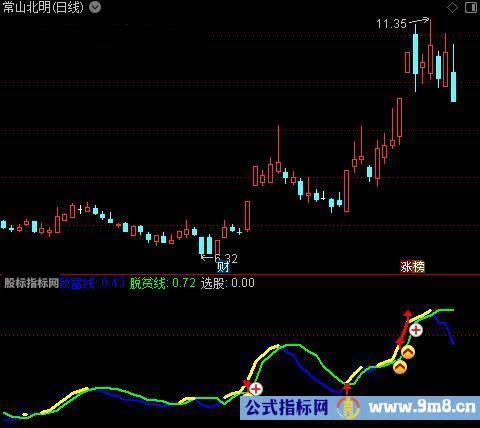 NOTEXT1:IF(致富线>EMA(脱贫线,1),致富线,DRAWNULL),COLORYELLOW,LINETHICK3;