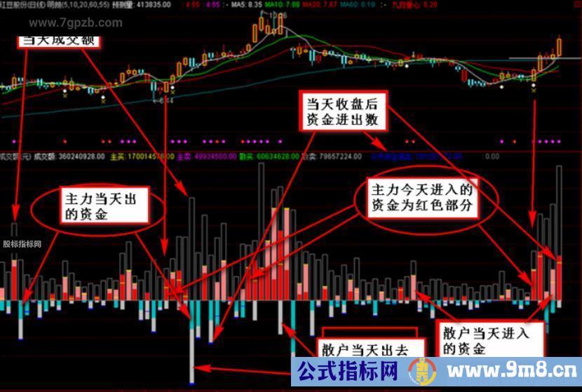 STICKLINE(今天资金进出>0,今天资金进出*1.003,今天资金进出,2.5,0),COLORYELLOW;
