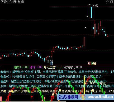 DRAWTEXT_FIX(1,0,0.45,0,'条件:副图出现“筹爆”三角或“起爆点”信号的相邻1~5日内,出现主图“钱袋”信号或低位转9情形为最佳,如再对应副图出现“探底点”信号,视为加强信号。'),COLORCYAN;
