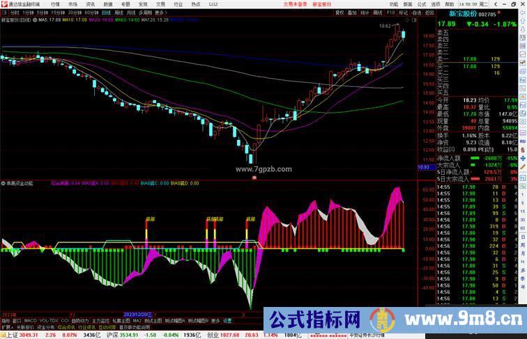 底部:STICKLINE(crOSS(BB,9),0,10,1.7,0),COLORFF00FF;
