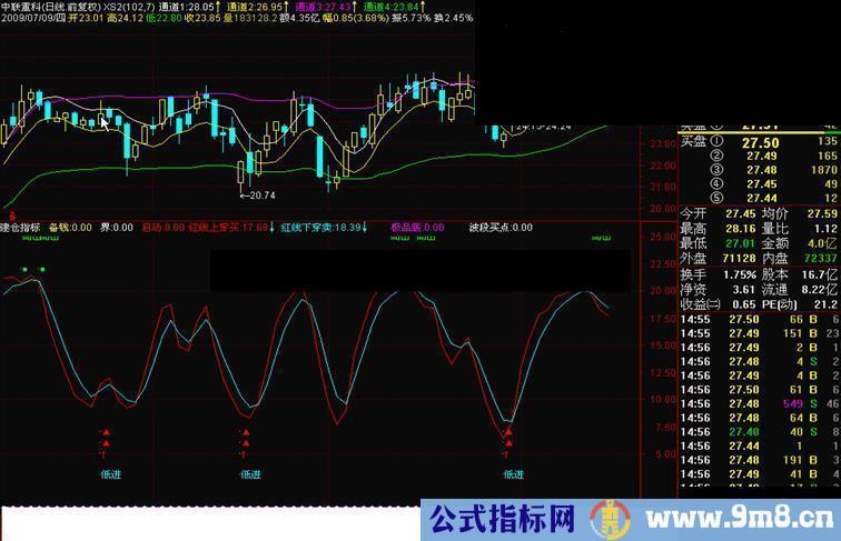红线上穿买:EMA((VA-VB)/(VC-VB)*27,5),COLORRED;