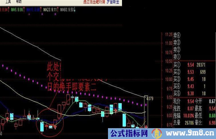均线粘合指标盛行多年,具体用法有很多版本,最近本人结合均线粘合,量比,换手 经过1个多月的精心观察及验证总结了一下几个要素,发出其中两个要素供大家参考,其他要素还在验证摸索中,机会成熟时发给大家:要素一:短期均线(3,5,10,23)粘合 长期均线(5,10,23,44(也就是公认的牛熊线,EMA(C,40)就是40日线的指数移动平均也就是44日线))粘合 以 60日线为主要压力位与支撑位 要素二:24日换手集合 另外两个要素大体意思是:换手与分时量比 (还在摸索中....)下面是截图及源码