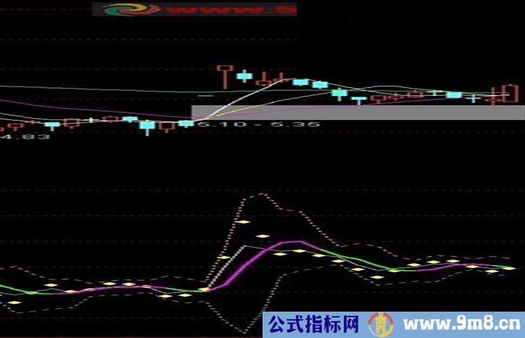 CDP:REF(H+L+C,1)/3,COLORLIGRAY; XL1:=SLOPE(CDP,3); A1:=FORCAST(CDP,3)-2*XL1; JYC:(A1+3*XL1),CIRCLEDOT; MAJYC:MA(JYC,4),LINETHICK2,COLORMAGENTA; JG:MAJYC+2*STD(JYC,4),DOTLINE,COLORLIRED; JD:MAJYC-2*STD(JYC,4),DOTLINE,COLORLIGREEN; IF(MAJYC