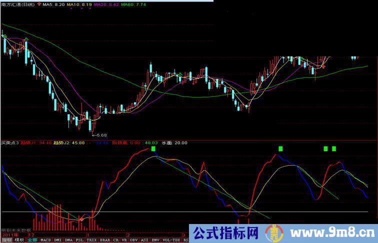 红色竖状体为底部上涨能量,红线上穿黄线为买入信号,蓝线为短期卖出信号,