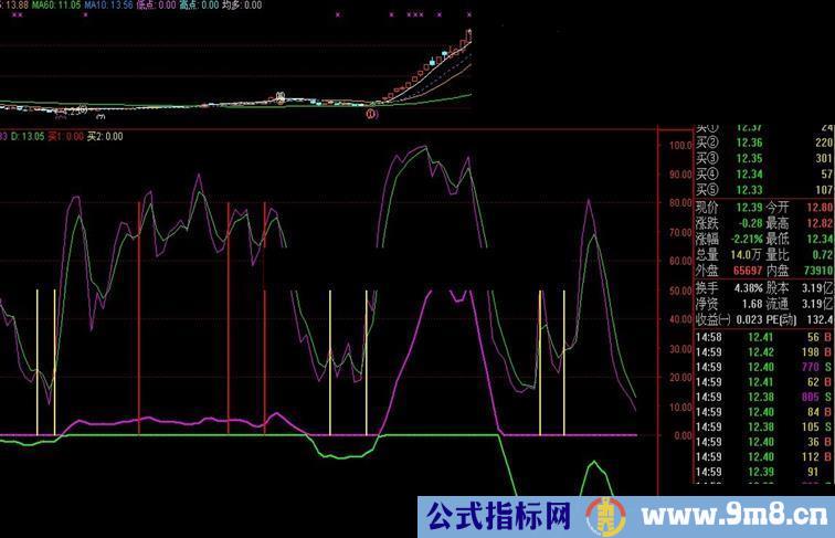 操作方法:大盘指数的粉色线在上时,属于波段买入阶段;在此阶段中,个股的粉色线在上时,出现买一、二,均可买入。当然,能配合MACD指标用就最好。