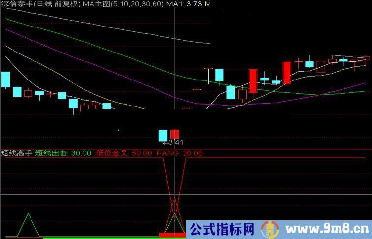 短线出击:IF(CROSS(短线买点,1) AND (短线买点<30),30,1),COLORGREEN;