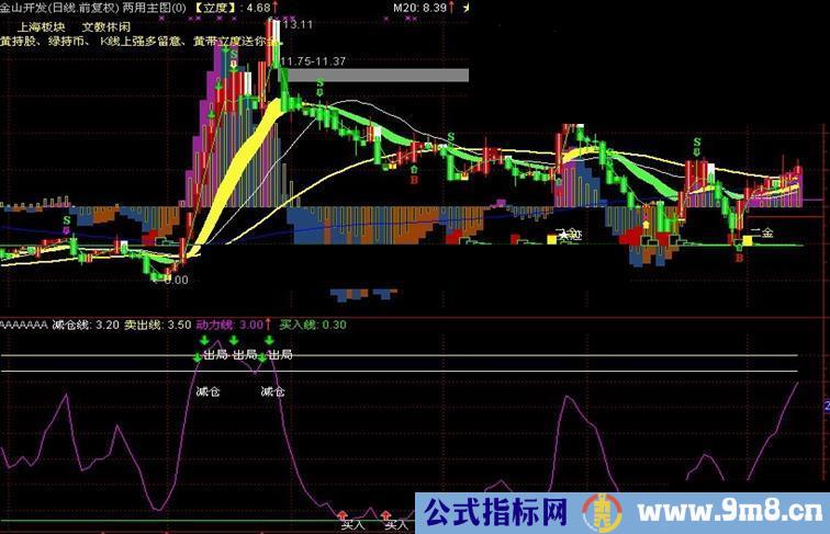 DRAWTEXT(CROSS(动力线,减仓线),2.8,'减仓 '), ,;