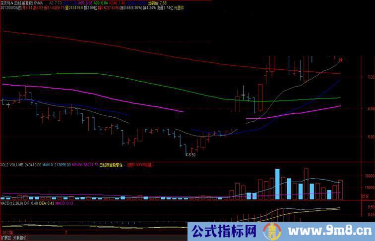 混合K线是指以美国K线为主,对涨停的股票用红色蜡烛线标注,对涨幅3.5%的中大阳线用暗红色K线标注。好处:趋势看得更清,大跌不恐惧,阳线支撑一目了然。如图。下面是均线的代码,你把它加到你的均线指标上面就可以了,然后,在通达信主图类型选择美国线。