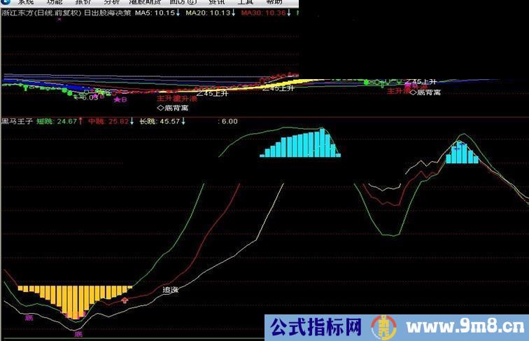 底:DRAWTEXT(CROSS(中跳1,-90) AND (长跳<中跳 AND 长跳>REF(长跳,1)OR 短跳<28 AND 中跳<28 AND 长跳<28),长跳,'底'),COLORFF00FF;