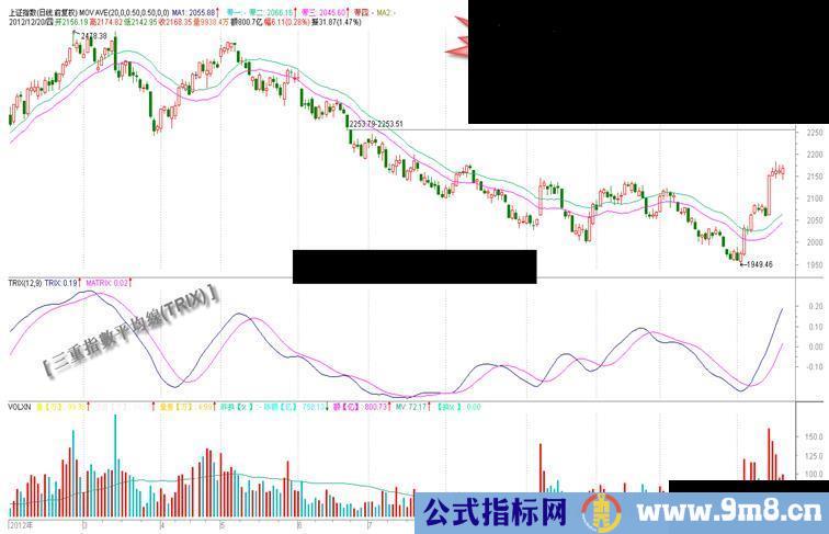三重指数平滑平均线(TRIX)属于长线指标。它过滤掉许多不必要的波动来反映股价的长期波动趋势。在使用均线系统的交叉时,有时会出现骗线的情况,有时还会出现频繁交叉的情况,通常还有一个时间上的确认。为了解决这些问题,因而发明了TRIX这个指标把均线的数值再一次地算出平均数,并在此基础上算出第三重的平均数。这样就可以比较有效地避免频繁出现交叉信号。 TRIX指标又叫三重指数平滑移动平均指标,其英文全名为“Triple Exponentially Smoothed Average”,是一种研究股价趋势的长期技术分析工具。