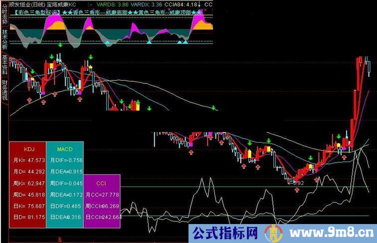 奉献给大家的模块是:1主图均线模块, 2主图宝塔线模块 , 3KDJ彩带模块 , 4CCI彩带模块 ,5主图底部显示KDJ+MACD 的月、周、日彩条模块 , 6显示威廉顶底模块, 7数显KDJ+MACD+CCI模块, 8主图标识文字模块。可以分别用其中的几种叠加成自己实用的指标公式来。
