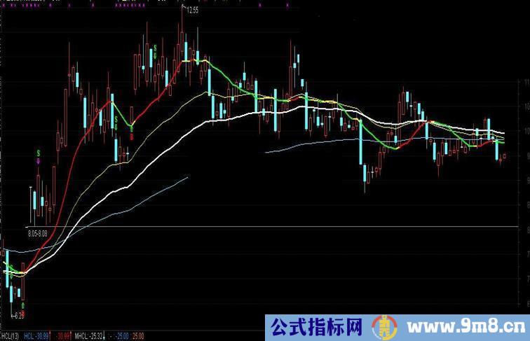 涨:IF(MA(CLOSE,13)>REF(MA(CLOSE,13),1),MA(CLOSE,13),DRAWNULL),COLORRED,LINETHICK2;