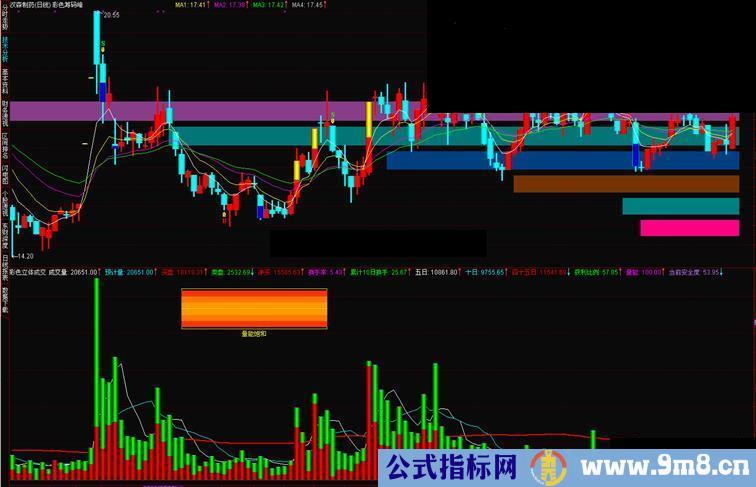 立体成交量不知道是哪位前辈的东东,我表示感谢了。我在指标里加了量解盘、量能饱和度、获利比例、和当前安全度。