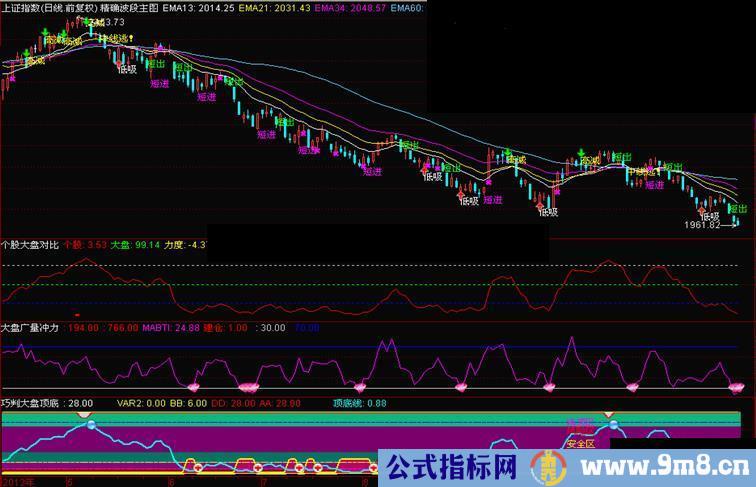 3.大盘广量冲力(副图):标明阶段底部(红钻),抄底用。