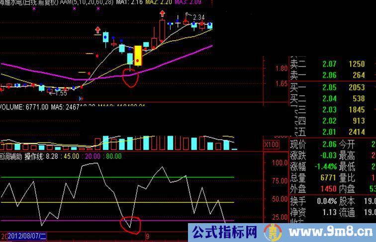 回调辅助 LC:=REF(CLOSE,1); 操作线:SMA(MAX(C-LC,0),2,1)/SMA(ABS(C-LC),2,1)*100; 45;20;80; 涨停回调介入有效 操作线从20下往上突破,就是底部已经形成,开始涨升,实际操纵起来,在平衡市以及牛市中,只要操作线进入20以下,就可以开始考虑进入操作,准确率较高,特别是用在涨停回调确认比较有效。特别建议不要在大盘不好的时候介入。