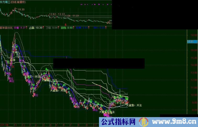 通过动态百分比还可以看到下跌过程中的每一个反弹低点,而且是那么准,大家可以看看,百分比线下行后止跌时就是一个低点。