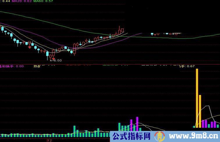 STICKLINE(换手>2 AND 换手<5,0,换手,0.3,0)COLORFF00FF;