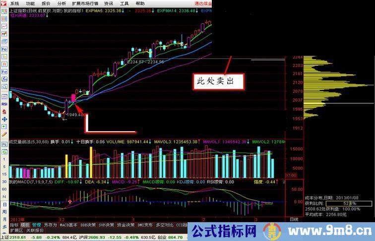 红K买进:IF(买进条件,L,H),COLORMAGENTA,POINTDOT;