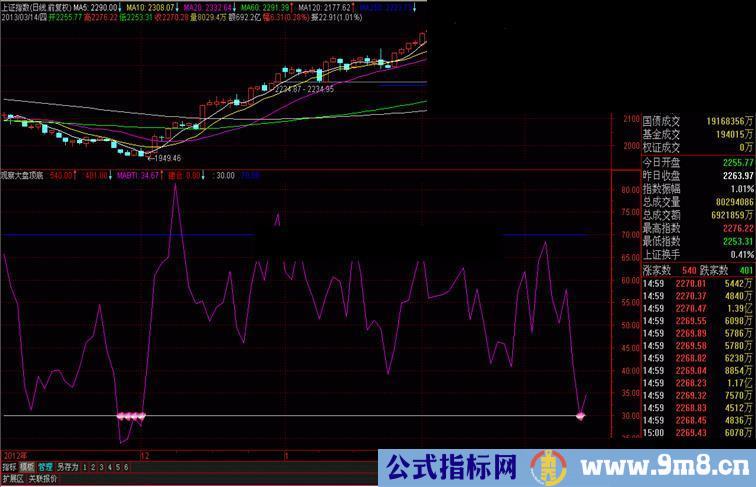 1、当MABTI参数小于30,表示短期见底,并且建仓出现数值为1,则大盘第二天收阳线的概率几乎100%,预示大盘即将上攻;