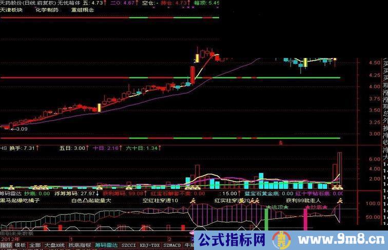 该指标是由无忧箱体改进而来,加入了股票所属行业,概念,板块和上市以来共多少涨停板,最后标出了半个箱体的幅度,以有利于使用者判断有无操作价值。这是主图指标,图中涨停,跌停用全红,全绿,超4%涨幅用黄色,超4%跌幅用蓝色,一目了然地发现主力运行的轨迹,如果再能配合筹码雷达那就能更加准确地捕捉到个股的启动。