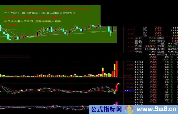 DRAWTEXT(T8=1 AND CURRBARSCOUNT=58,AAA-(AAA*TS8),'倒转锤头构成一个看涨信号,可能见底回升‖'),COLORFF00FF