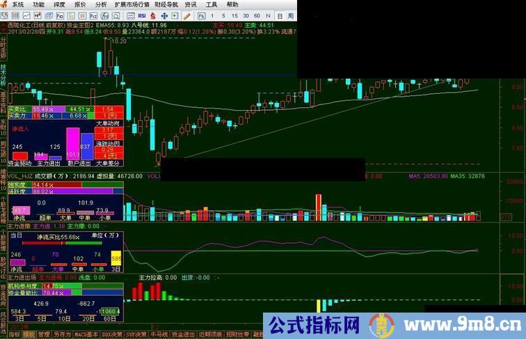 段时间看到坛子里朋友们对资金看盘公式指标大感兴趣,自已在网上找了一个《看盘加强板的》的指标,仿着坛子里朋友们发的图片,组成了以下一主三副的四个资金模块。喜欢花哨画面,对资金感兴趣的朋友拿去吧,编辑公式水平不高,对通达信的L2资金也不太清楚。所以难出错的地方,不对的欢迎指导。