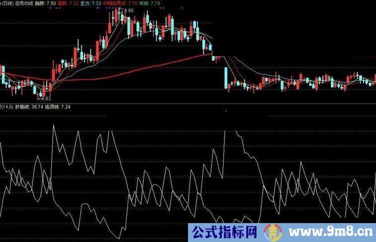 取自于系统的一个常规指标,在使用中感觉线束太多而影响视线,尝试化繁为简后留下最为适用的两条线.白线为抄底线,黄线为逃顶线.