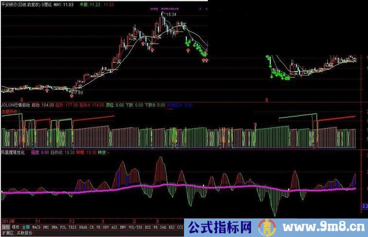 强度: MA(MAV,9)*0.8+1,POINTDOT,LINETHICK5,COLORFF00FF;