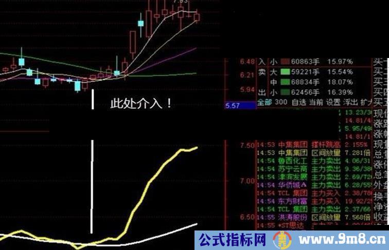 线2:(MA(CLOSE,33)+MA(CLOSE,41)+MA(CLOSE,49)+MA(CLOSE,57))/4,COLORWHITE,LINETHICK3;