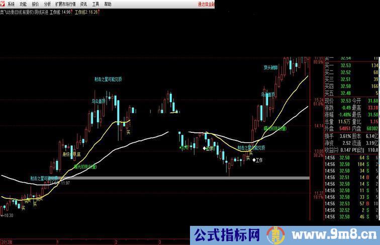 DRAWTEXT((九号线>=REF(九号线,1) AND 牛 AND L<九号线 AND H>九号线)