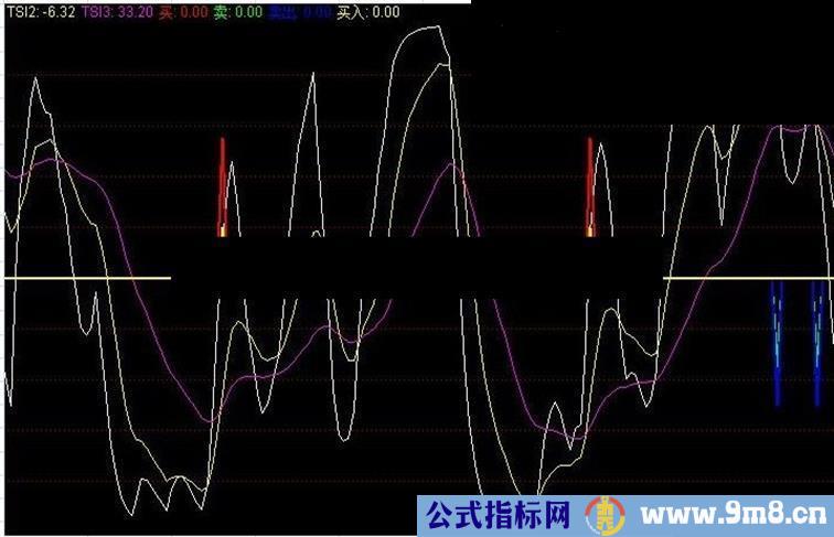 卖出:IF(CROSS(TSI2,TSI1)AND TSI1>50 ,-50,0),LINETHICK2,COLORFF0000;